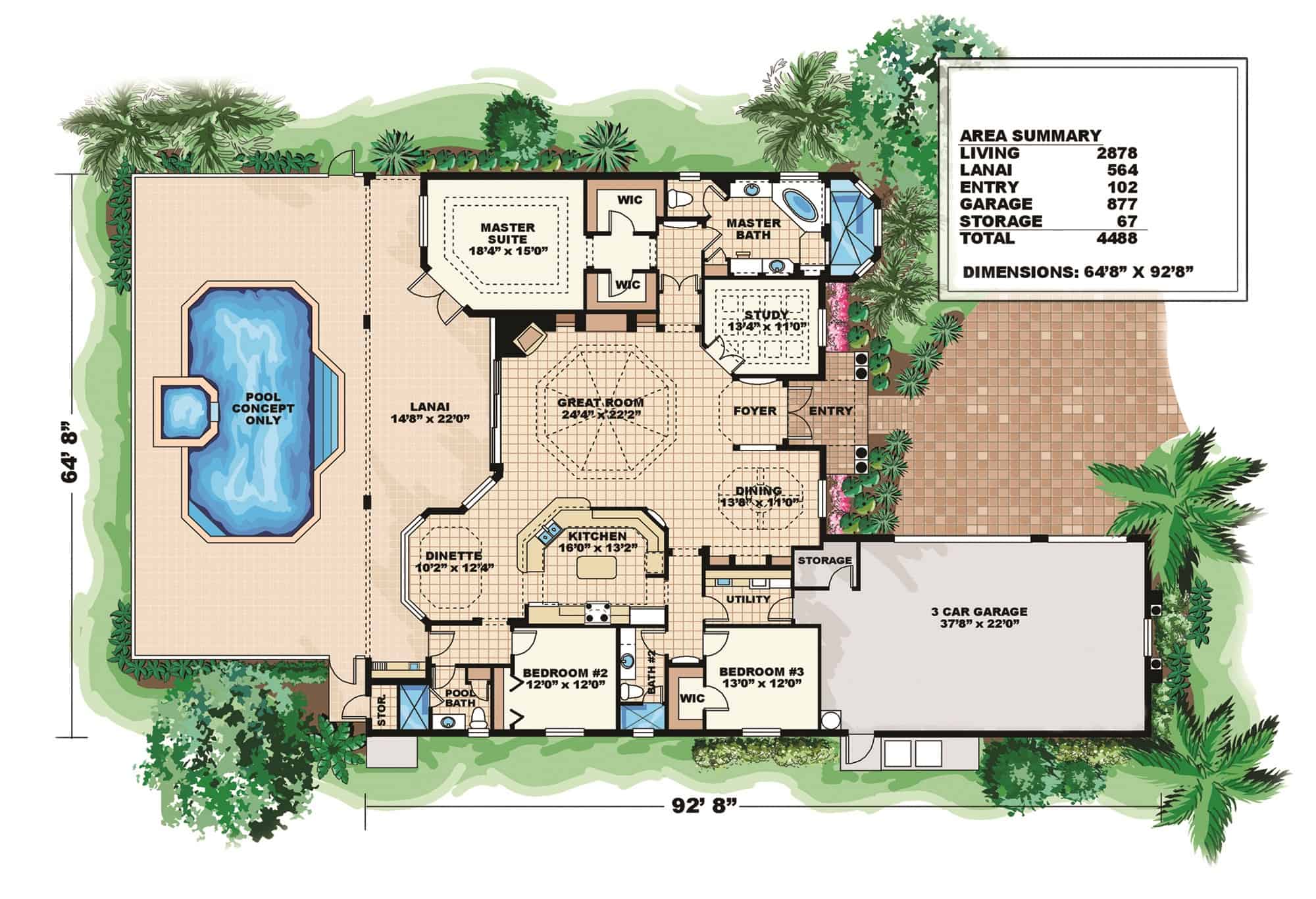 This Mediterranean home has a functional layout and some great bonus features, including acovered lanai and a main-level master suite.