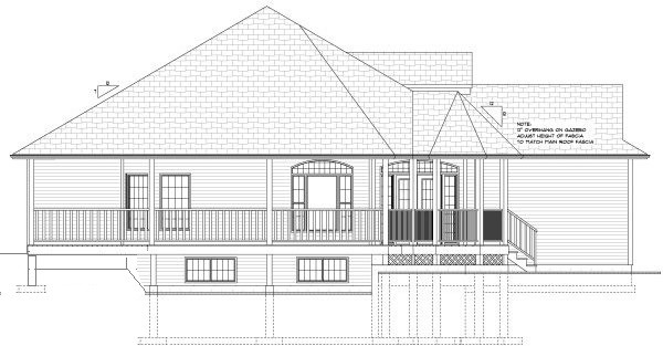 A built-in gazebo on the front corner expands the usable porch area and gives this home a unique look. The main floor of this plan features 9'-0 high ceilings to add more volume to this already open design. Decorative columns define the foyer, but present no visual barrier, from this point you can easily access all areas of the home. The spacious living area to the left of this design is great for entertaining and is warmed by the three-sided gas fireplace, all rooms open out onto either the gazebo or covered rear deck. The well appointed Master Bath is very luxurious and the big...