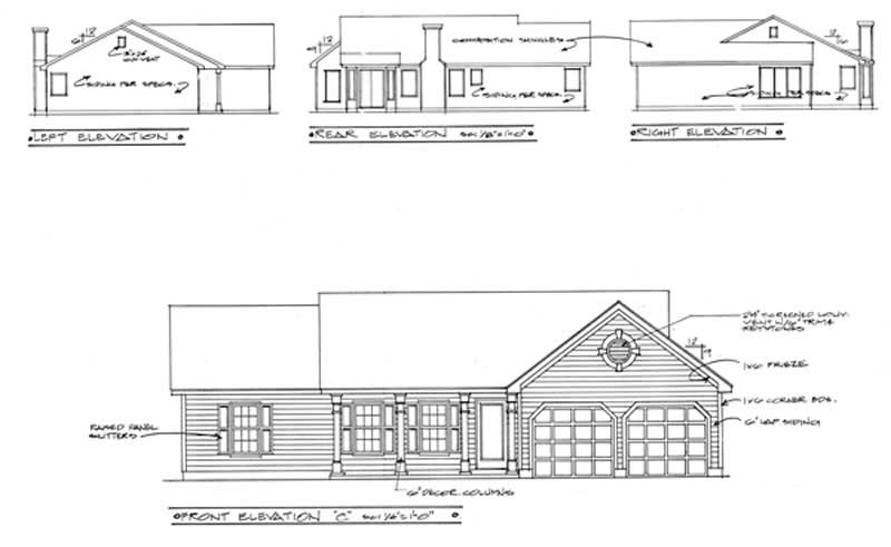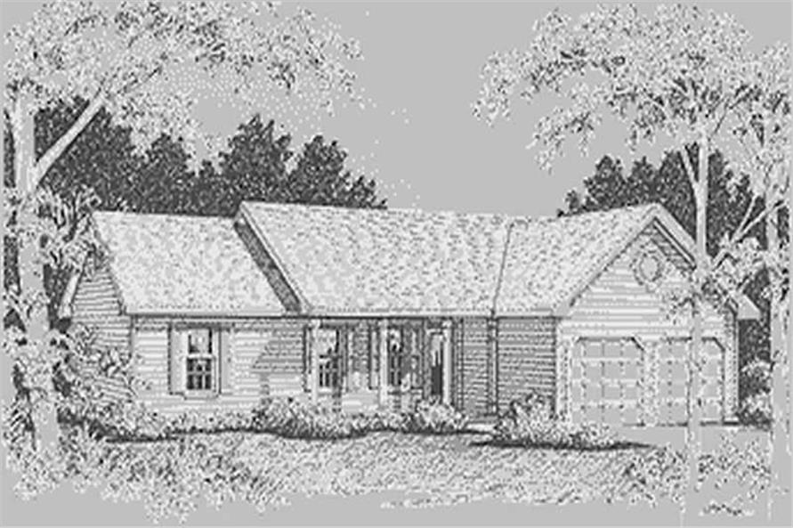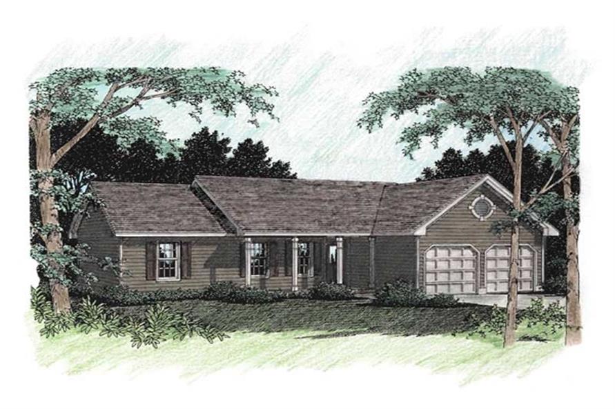 This affordable ranch is available in a choice of siding (as shown), brick or stucco exteriors. This simple yet appealing design offers three bedrooms, two full baths, a living room, dining room and eat-in kitchen. The 14'x18' living room has a vaulted ceiling and fireplace. A spacious bay with French doors highlights the dining room. Windows abound in the sunny eat-in kitchen. The washer/dryer is tucked in a convenient laundry closet off of the kitchen. A two-car front-loading garage tops off this well-planned design.