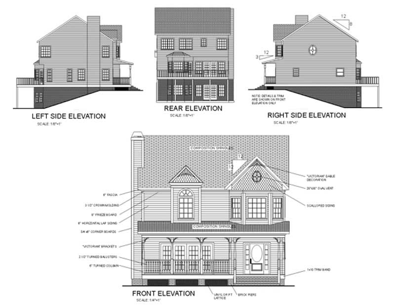 This delightful Victorian style home, with its compact footprint, is the perfect choice for narrow lots. Spacious rooms, a covered porch and the large deck may make this design irresistible. Beyond the front porch is an inviting entry. To the left is the family room featuring a fireplace and double French doors opening onto the porch. Double French doors lead to the dining room while yet another set leads to the enormous deck. The open kitchen includes a 3'x5' island. A 2'-6 French door leads to the deck from the bayed breakfast area. Lower level ceiling heights are 9'.