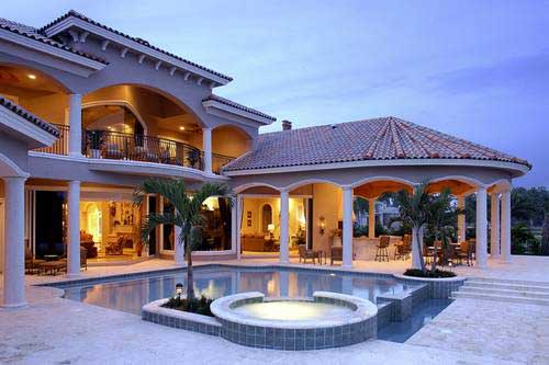 The stunning Luxury style house plan embraces many unique Mediterranean features. Stylish front steps lead to a veranda with large double-entry front doors. As you enter the grand foyer, you are treated to a magnificent view of the pool area and beyond through the large pocket sliding-glass doors featured in the living room. A lovely fireplace and built-in shelves grace one...