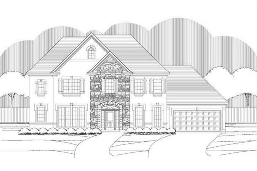 House Plan #461 is a two story traditional style home with stucco and cultured stone exterior and 4070 total living square feet. It has 5 bedrooms and 3 baths as well as a straight in front load 3 car garage. This home plan has 1 living area, 2 dining areas, a butler pantry, a home office, a porte cochere, a wine closet, a covered rear porch, a master with sitting area, and a separate master closet.