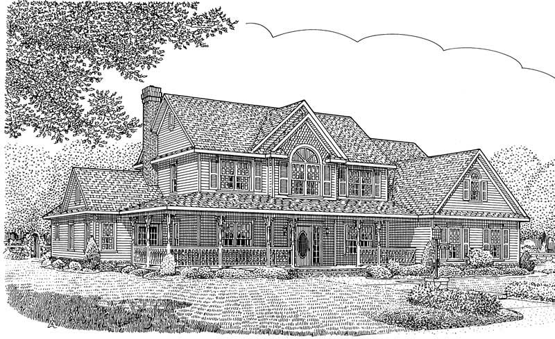 This house plan offers plenty of space in a classic counrty victorian farmhouse. The master suite on the main floor has access to both the front and back covered porches, and includes a nice master bath. The two car garage has a workshop with storage space. The upper floor has a large family room with access to a spacious unfinished storage room above the garage. See also plan E162.