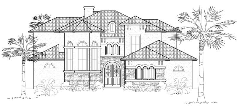 Think Spain, Italy, or the Greek seaside when you look at this 2-story, 4-bedroom Mediterranean home plan. Its uneven rooflines with the signature terra-cotta roof tiles, stucco walls, windows, arches, and grassy courtyard highlight the elegant and colorful features of the Mediterranean house plan design. Inside the arched entrance is a spaciously laid out main level with a welcoming foyer, raised study, dining room, open floor plan Great Room – family room/kitchen with walk-in pantry and breakfast nook that opens to the lanai. The master suite and another bedroom flank...