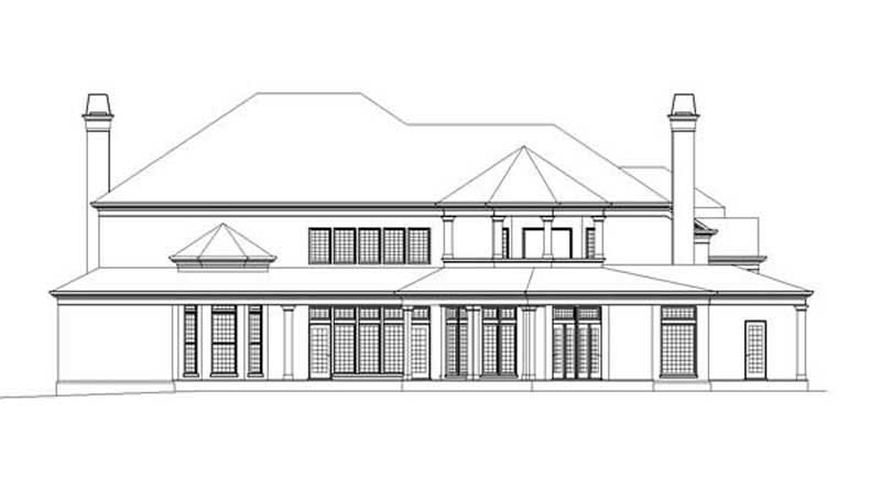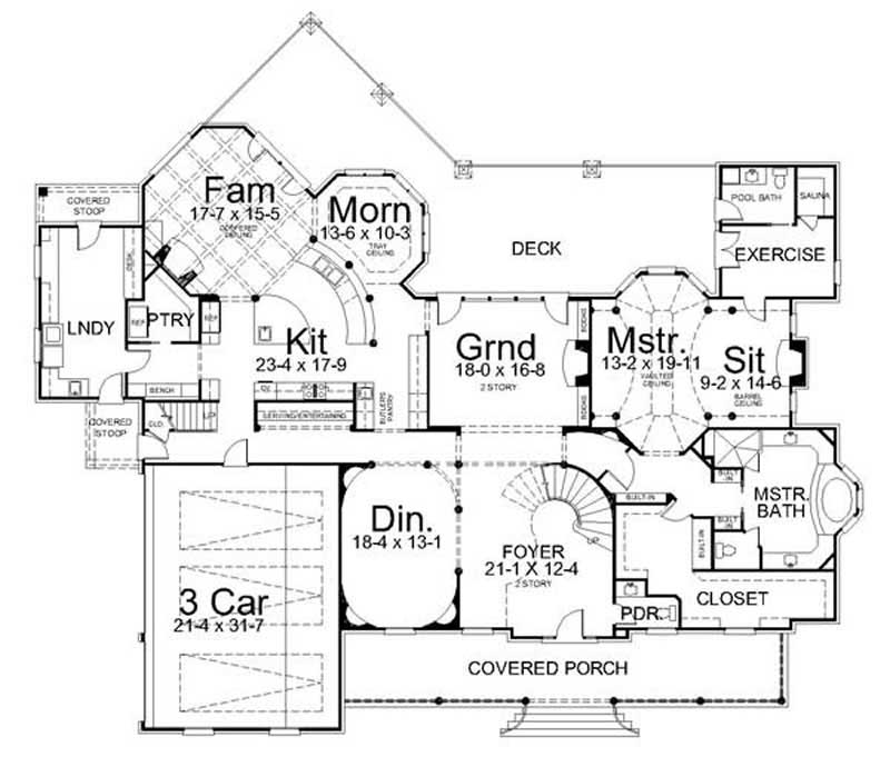 These Luxury home plans has an inviting rocking chair main covered porch leading to the grand foyer. The adjoining living and dining rooms with pillared entries provide an impressive formal area off the front foyer. The master suite features a walk-through dressing area with a generous closet and a lavish master bath with his and hers vanities. Off the master suite is also an exercise room with pool bath and sauna. A sweeping spiral staircase leads to the second story of these luxury house plans, featuring a play/media room, three bedrooms with full baths and a covered deck.