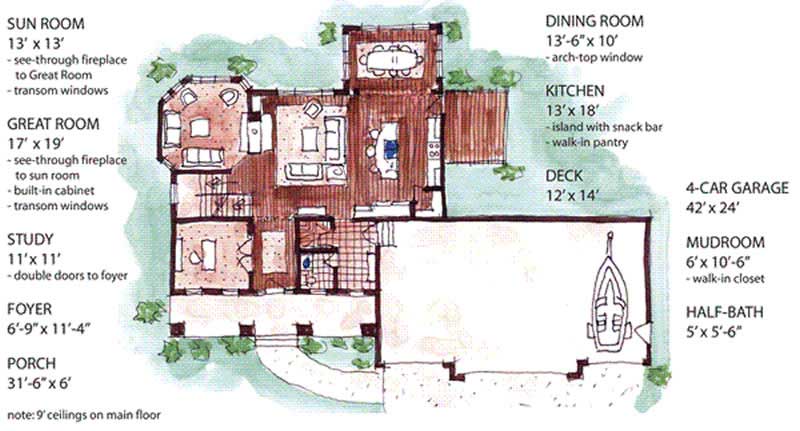 Craftsman influences enhance this two-story, country-style home. The front porch is perfect for conversing with friends on a lazy afternoon. Inside, sidelights brighten the inviting foyer. Straight ahead, the spacious Great Room hosts any gathering in style. A three-sided fireplace is a nice focal point. The adjacent sun room is a secluded spot for reading a good book. The open kitchen is a chef's dream. The oversized island hosts a curved snack bar. A corner pantry keeps ingredients organized. A French door accesses a side deck. The amazing dining room offers panoramic views through windows...