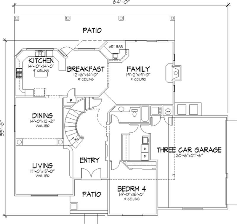 A three-car garage and four spacious bedrooms are two features that make this beautiful home perfect for the growing family. A front patio entrance provides views of the roomy living areas, which feature vaulted ceilings. A grand circular staircase winds to the second-story bedrooms. A large U-shaped kitchen connects to a breakfast room, while the adjacent family room boasts a wet bar and a fireplace. A full-length patio can be reached from the breakfast room. The master bedroom includes a private bath and vaulted ceilings for stylish comfort.
