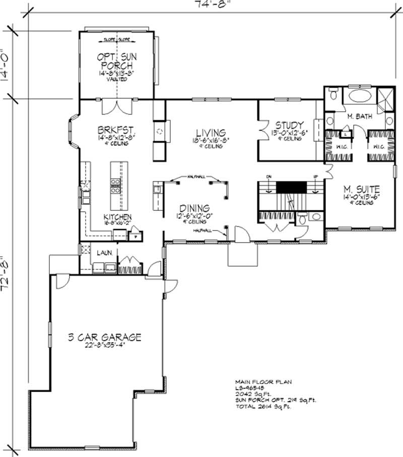 The cleverly concealed side-entry garage adds to this early American-style home's curb appeal. An open, airy feeling reigns inside, the living room melding with the dining room over a columned half-wall. The L-shaped kitchen has a long cooking island with a snack bar built in; a bayed breakfast nook offers a casual spot for meals, as well as access to the optional sun porch. The master suite has his-and-hers walk-in closets, dual sinks, a private toilet, a shower and a spa bath.