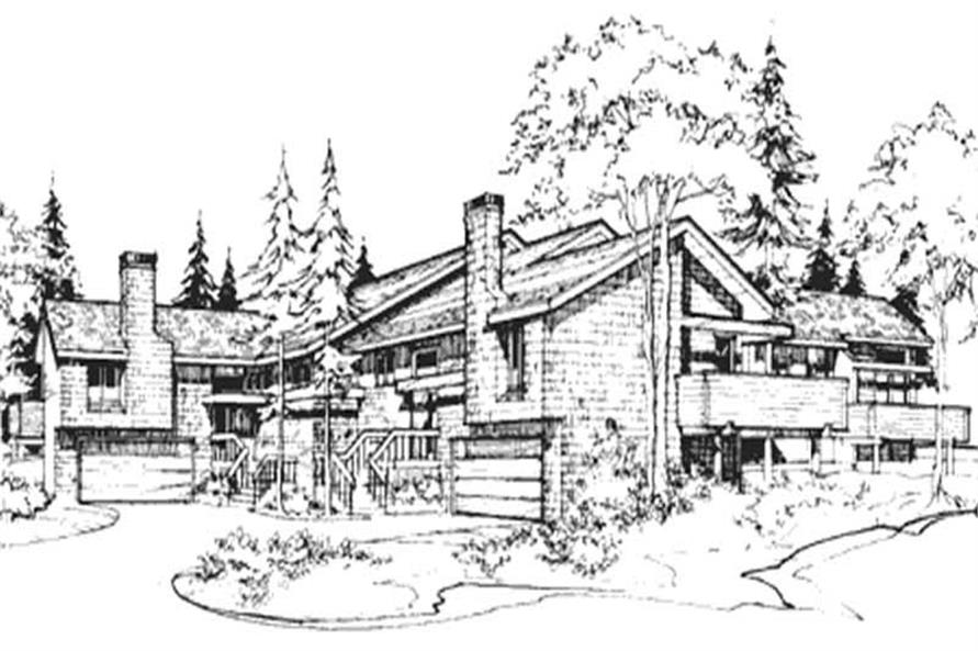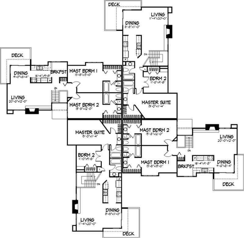 This cedar-sided fourplex looks great in a rustic setting. Unit A's main floor consists of a galley-style kitchen that serves both formal and informal dining areas. Two master suites each feature a private bath. Downstairs there's a family room with a wet bar. Unit B's main floor consists of a living room and a dining room that flow together for ease in entertaining. The master suite has a private bath. A nearby den may serve as a second bedroom or a nursery. Downstairs there's a family room with a wet bar.