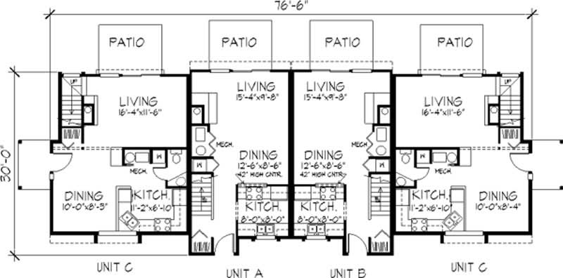 "This contemporary multi-unit design offers three exciting floor plans. Each unit features a living room or Great Room warmed by a cozy fireplace; sliding doors access a rear patio in each unit. Unit A has a master suite that overlooks the Great Room below. It has one bathroom. Unit B features a master bedroom and a loft that may be used as a second bedroom. It has one bathroom. The Unit C design (2 units) features two master suites, each with its own bathroom. The units also each have a half bath downstairs. "