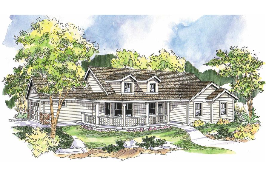 This single-story, country style home has 1,506 total living square feet. The design has an inviting look with a wide, railed, wrap-around porch and numerous windows. Inside, gathering spaces, including the kitchen and entry, all have vaulted ceilings. A peninsular counter/eating bar minimally separates the dining room and kitchen.
