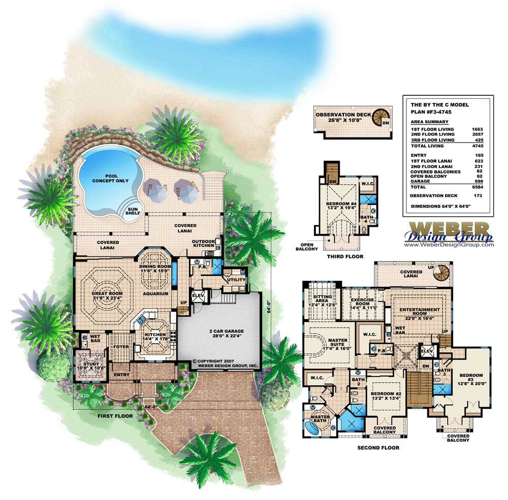 This house design is a beautiful three story, Mediterranean house plans with 4745 total living square feet. The floor plan has 4 bedrooms, 5 bathrooms, and a 2 car garage. These plans are perfect for anywhere on the coast or with a view lot!