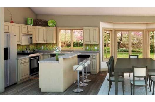 From the shaded verandah up front to the sunny patio out beyond, this lovely Country-style Ranch house plan promises ideas and moments – big and small – that enthrall. The semi-open verandah steps up and into the great room – with its vaulted ceiling creating lofty impressions and gas fireplace embracing you warmly. The kitchen and dining room are united into a cozy, bustling, open-plan space, weaving itself with the great room across the partitions that define it. Together they offer a rich aesthetic and experience that spills out onto the patio behind.