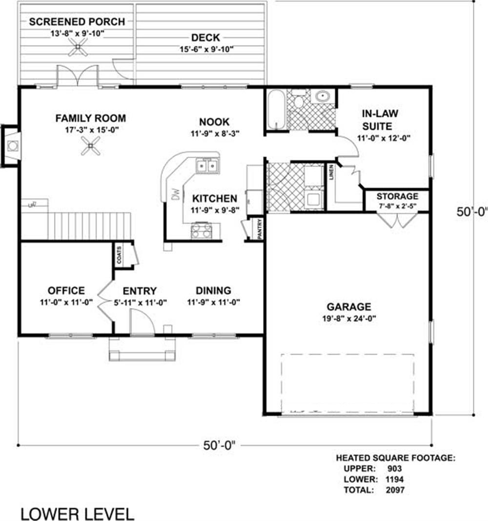This delightful colonial inspired design boasts 2,097 sq. ft. of living space. A covered porch flanked by columns welcomes you home. Once inside, step through double French doors into a private home office. Across the entry from the office is a spacious formal dining area. An open kitchen creates an atmosphere for both cooking and conversation. The fully appointed in-law suite located just off the kitchen/laundry area is a pleasant surprise. With a fireplace, ceiling fan and access to a roomy screened porch through double French doors, the 173 x 15 family room is the perfect spot to entertain...