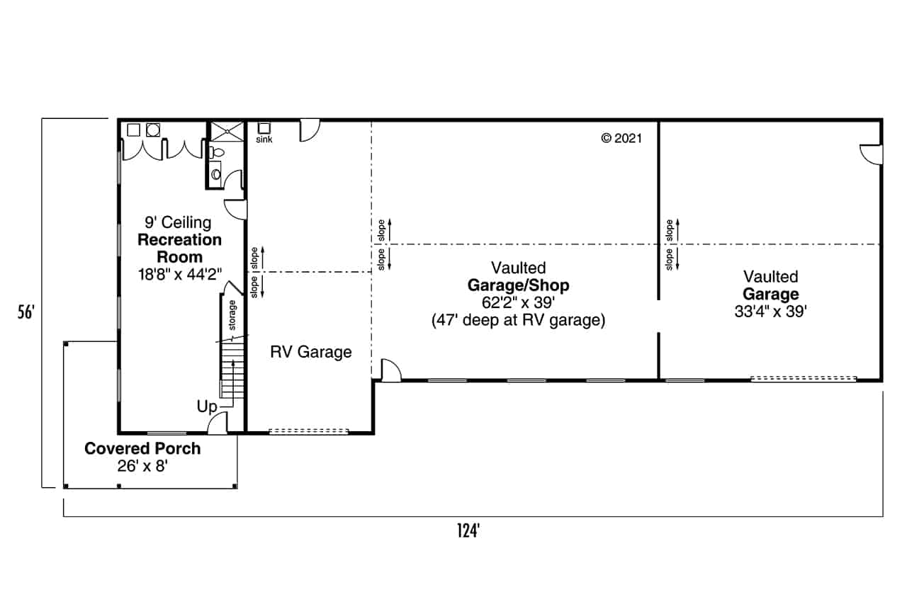 This very large garage plan has enough for up to 8 cars with a workshop, recreation area, full bath and plenty of storage space.