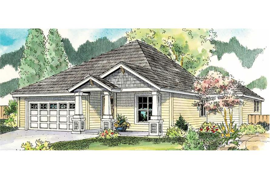 Craftsman-style windows, porch supports, and decorative gable ends lend their timeless appeal to the #108-1560. This small ranch-style home offers a combination of openness, economy and contemporary features that both empty nesters and young families will find appealing. Shake-textured shingles fill the triangular gable fronts, while also adding visual appeal to the framed-out bases of the tapered porch supports. Both are Craftsman elements, as is the covered porch. Its easy to imagine an old-fashioned wooden porch swing hanging from the ceiling on the right end, or a couple of cushioned...