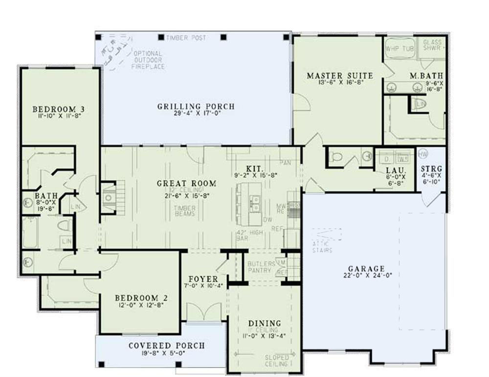 Even though only 1960 living square feet, this home has a rustic, country manor feel to it -- much larger than its actual size would suggest. The exterior catches your attention with its wood and stone, the covered porch with the timber columns, the dormer windows. Inside, The open floor plan creates a large, central space combining the great room and kitchen - the heart of the home. The fireplace, exposed timber beams, and wall of windows to the outside grilling porch create a grand yet warm, welcoming home. Form more formal occasions, there is the dining room with its sloped ceiling --...