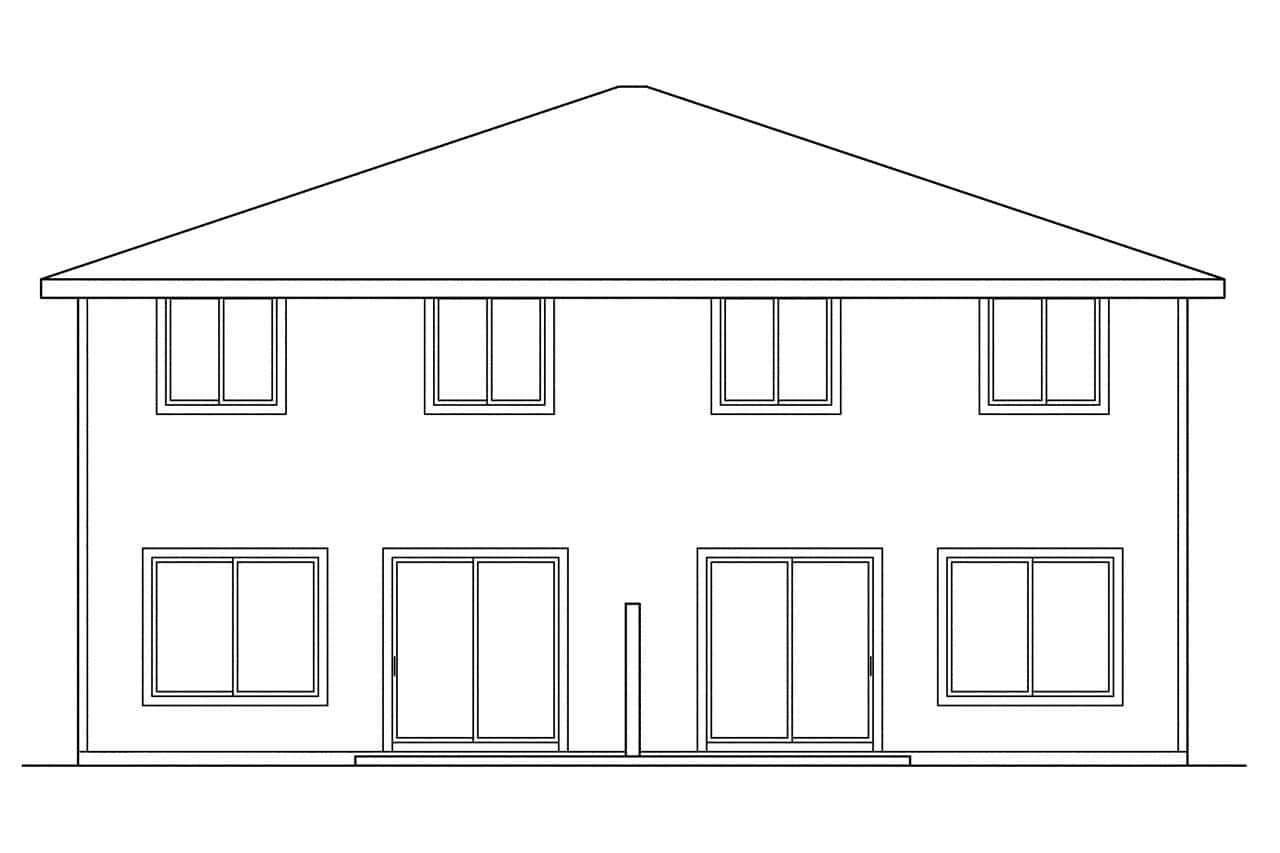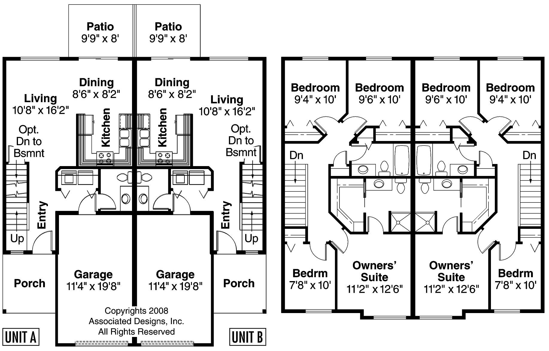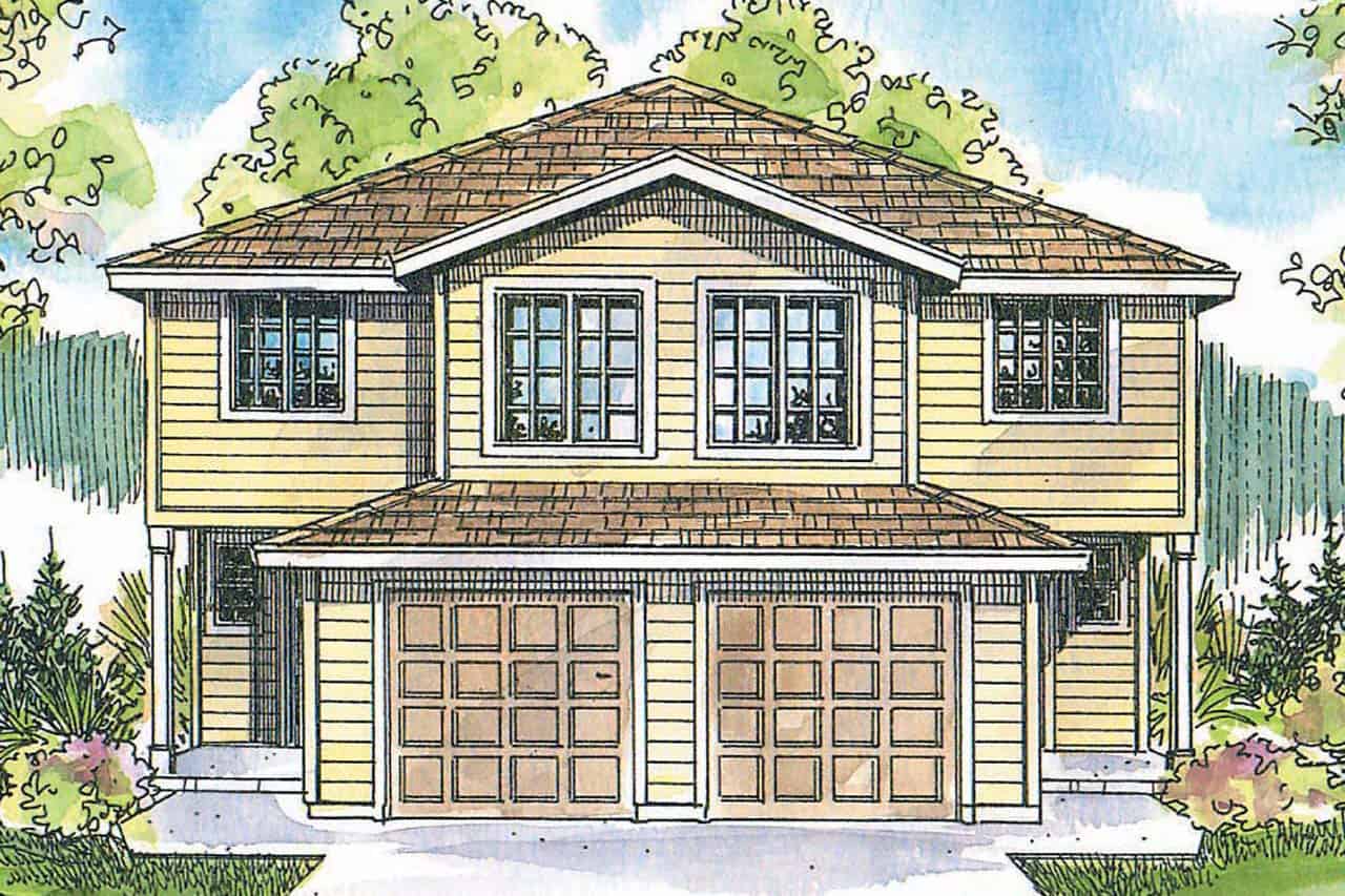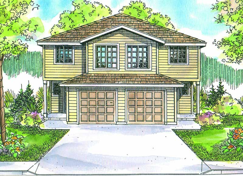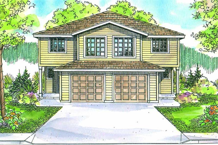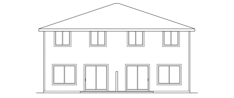 Each unit in this exceptionally spacious two-story Craftsman duplex plan is 1284 sq ft with 4 bedrooms and 2.5 baths. Each unit also has a garage that is 237 sq ft. On the ground floor of each, living, dining, and kitchen areas flow together in one bright and spacious room. Laundry appliances are near the kitchen, and sliders in the dining room open onto a patio. In the world of duplexes, four-bedroom units are rare. This two-story duplex works well as a townhouse. The plan is as economical to build as it is to maintain, and its compact footprint fits neatly on a narrow lot.