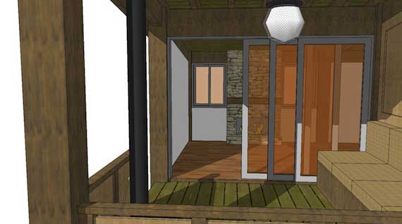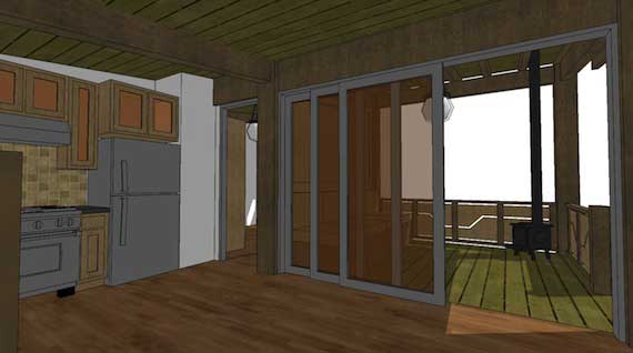 A modern hunting cabin, it has one bedroom, which can be furnished with a queen-size bed or two bunkbeds. The living area has a wood-burning fireplace, and the porch is heated with a small wood stove. A small tankless gas water heater is mounted on the outside of the cabin.