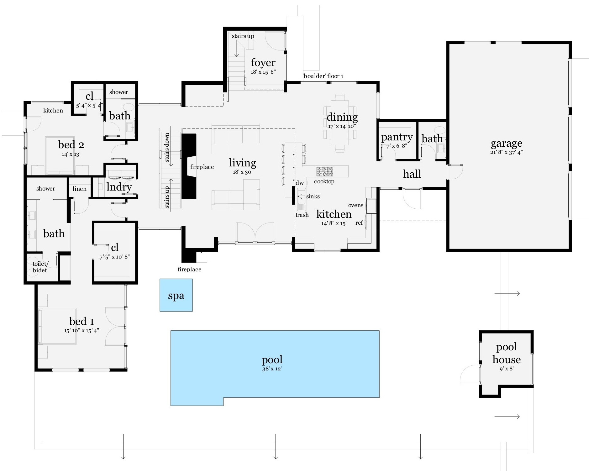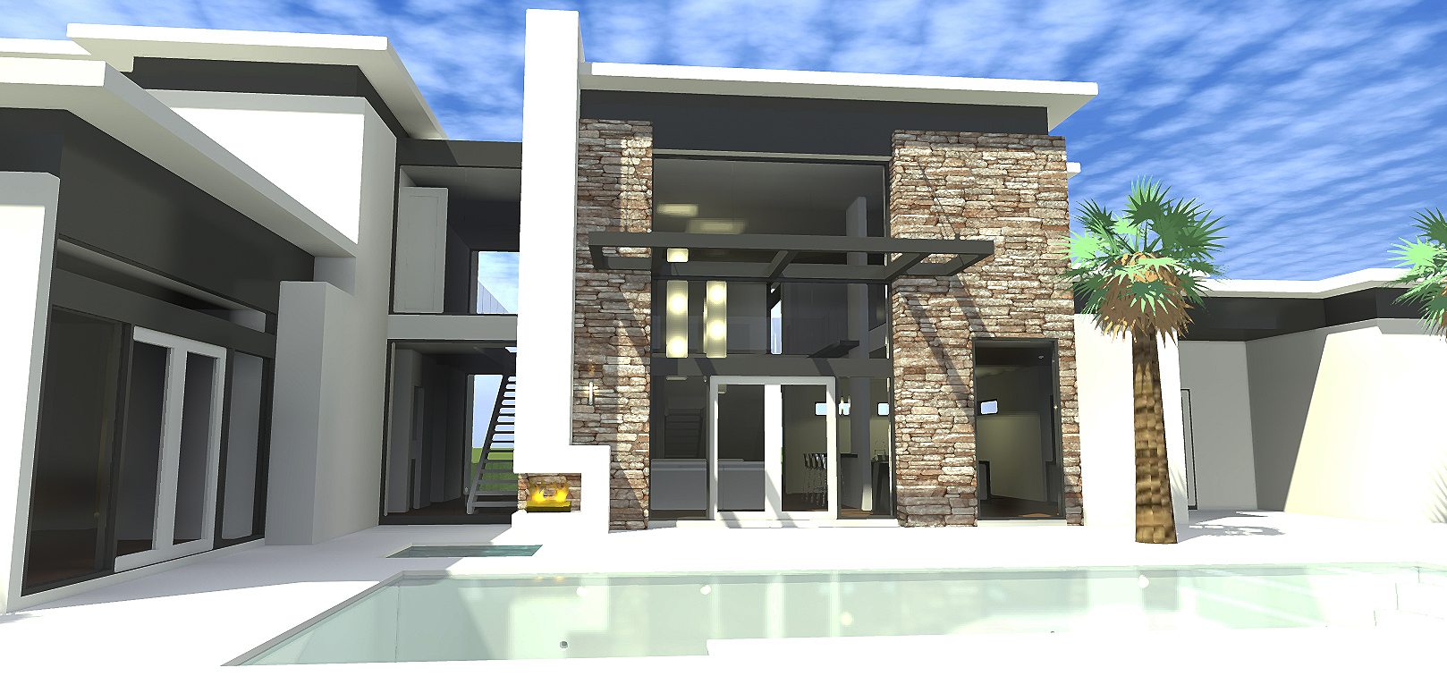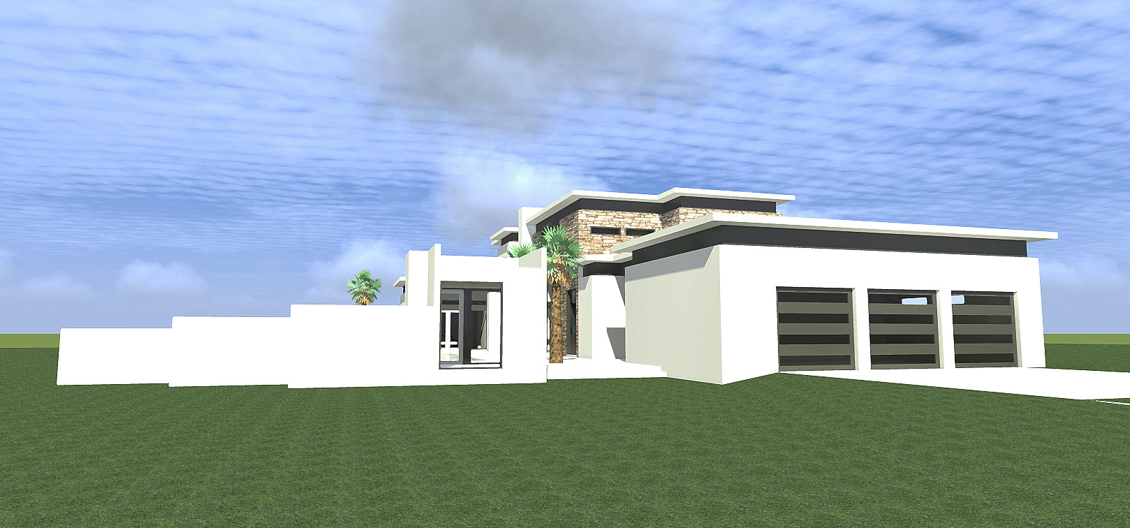 This bold, Modern style home plan with a California vibe has 3885 square feet of living space. The 2-story floor plan includes four bedrooms, three full bathrooms, and one half bath.