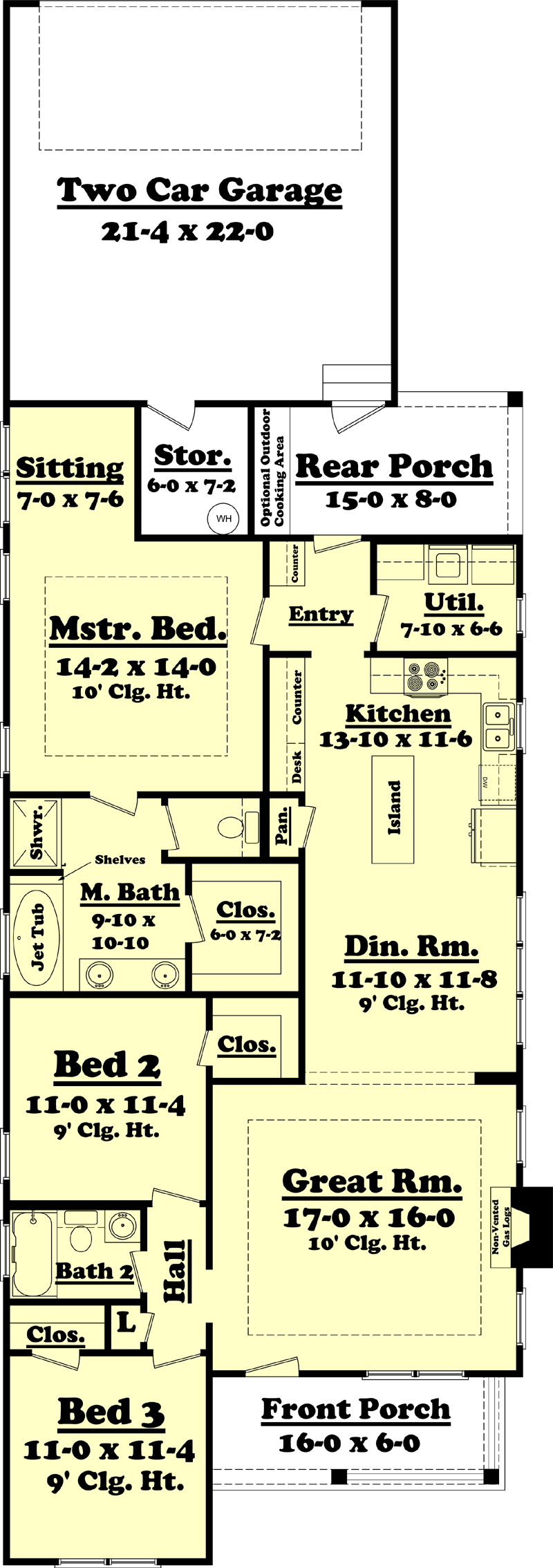 This charming cottage style home has over 1550 square feet of living space. The one-story floor plan includes 3 bedrooms and 2 bathrooms. The exterior of this home has a welcoming covered front porch. Inside, this house design's floor plan includes a well-designed main floor master.