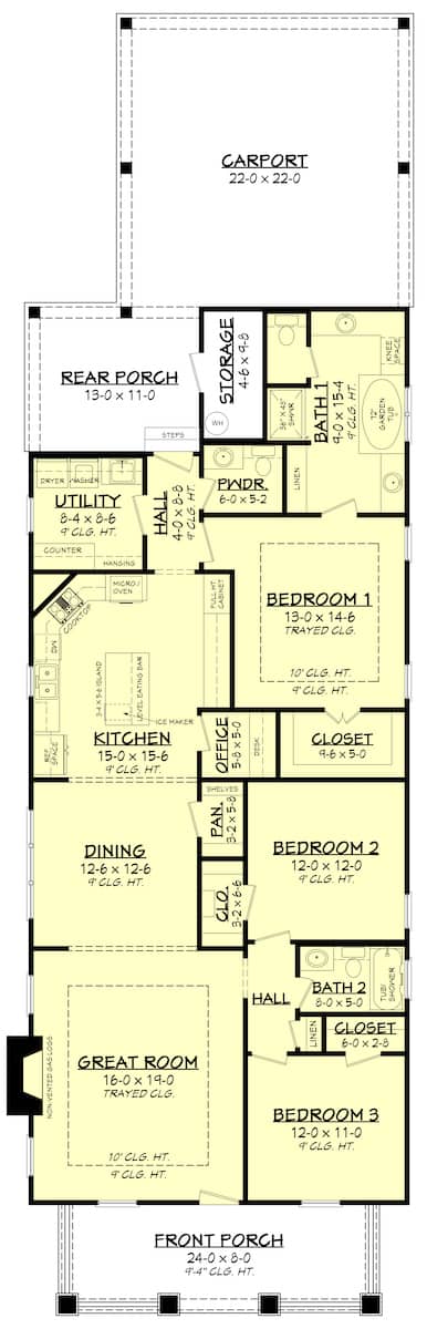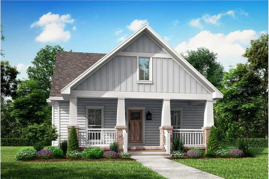 This charming bungalow cottage home with Craftsman detailing (Plan #142-1079) has 1800 square feet of living space. The one-story floor plan includes 3 bedrooms and 2 1/2 bathrooms. The exterior of the home has a welcoming covered front porch. Inside, the Great Room opens up to the dining room and kitchen, including a large island and breakfast bar. Toward the home's rear is a well-designed main floor master bedroom suite with a spacious master bathroom. A carport is at the very rear of the home.
