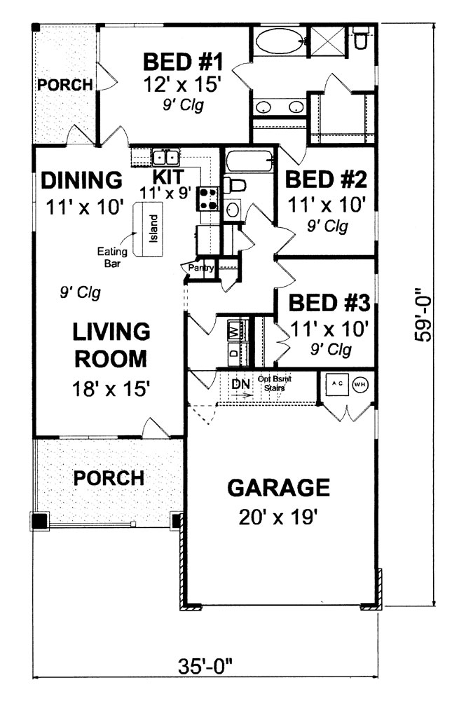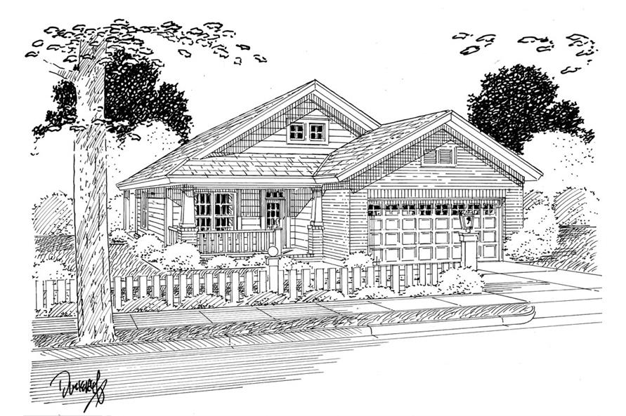 This charming Ranch-style home with Craftsman touches (House Plan #178-1268) offers 1,253 sq ft of living space. The 1-story plan includes 3 bedrooms and 2 bathrooms. An open layout connects the living room, dining area, and L-shaped kitchen with an island. The master suite features a soaking tub, dual sinks, and a large walk-in closet. The rear porch is accessible from the dining area and master bedroom. Two additional bedrooms with 9-foot ceilings and reach-in closets, plus main-floor laundry, complete this cozy home.