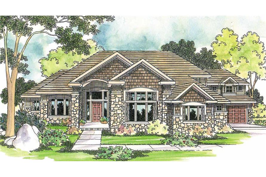 The #108-1383 home plan is a two story, craftsman style house plan with 4184 total living square feet. This contemporary craftsman home plan features rustic-looking stone veneer columns that flanks a lofty, arched entry. The family room with a fireplace is open to the expansive kitchen/dining room. The large home office is across the foyer from the window-bright living room.