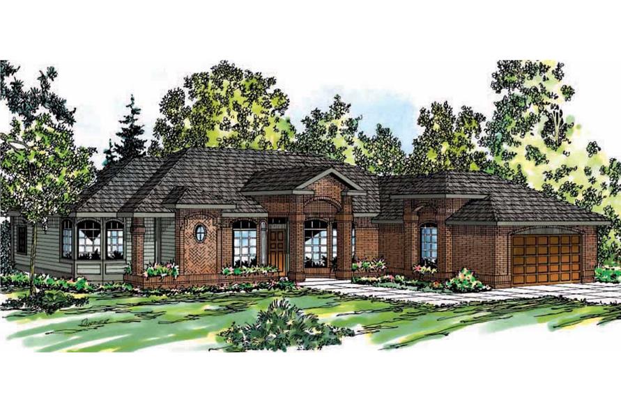 The #108-1339 is a single story, ranch style house plan with 2396 total living square feet. Dramatic brick pillars support the soaring arched portico entrance making this ranch home plan impressive right from the beginning. The vaulted living and dining room is bounded by spare columns. The bright family room with the fireplace is open to the spacious kitchen.