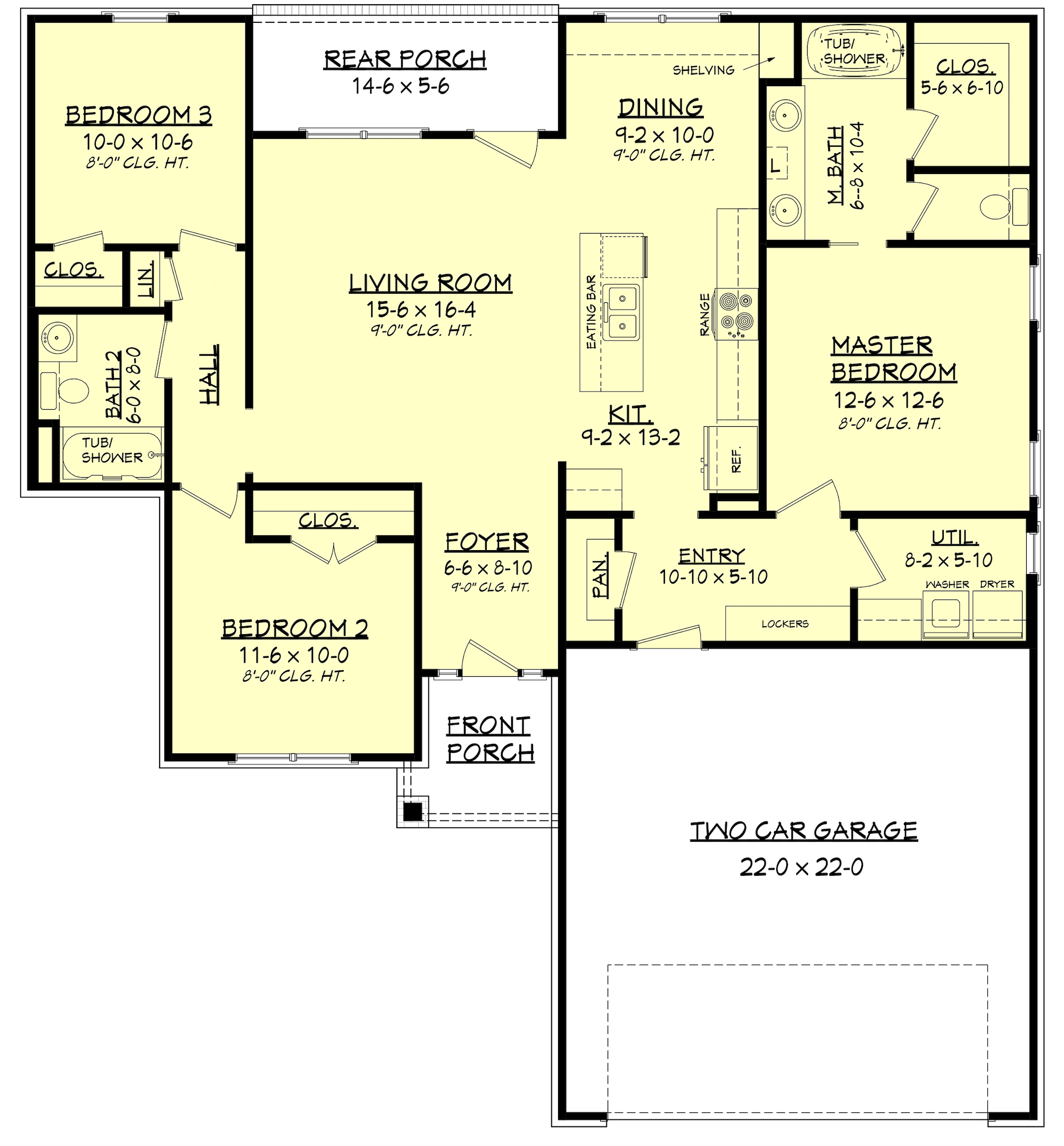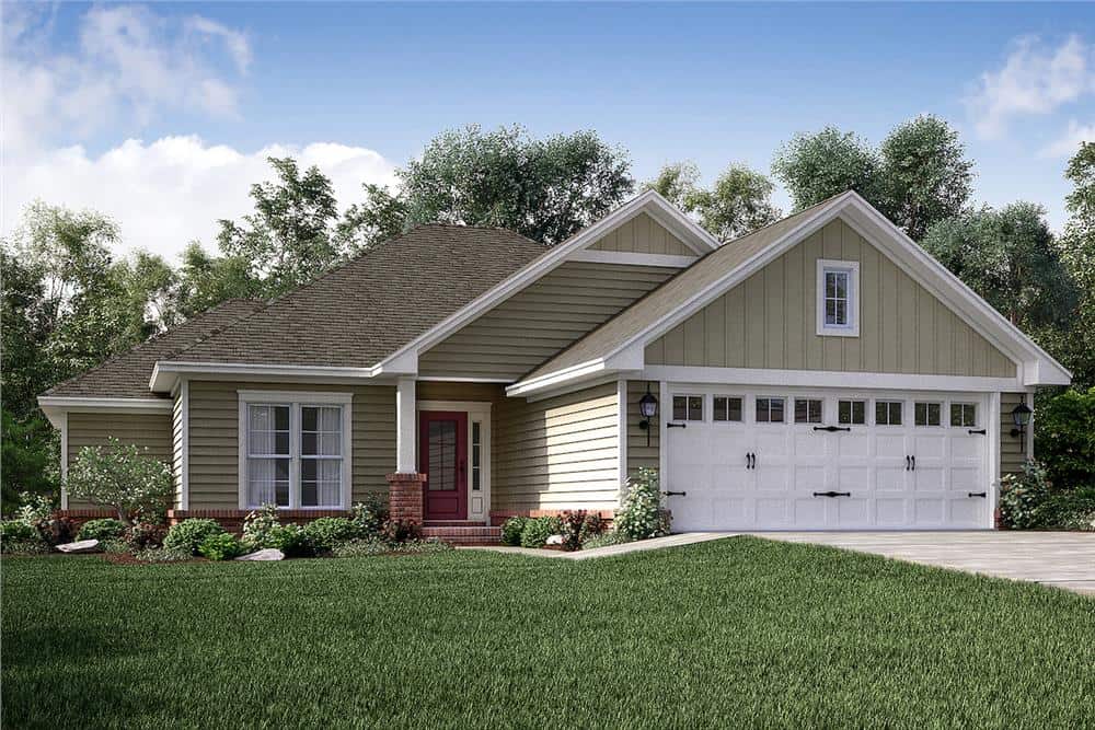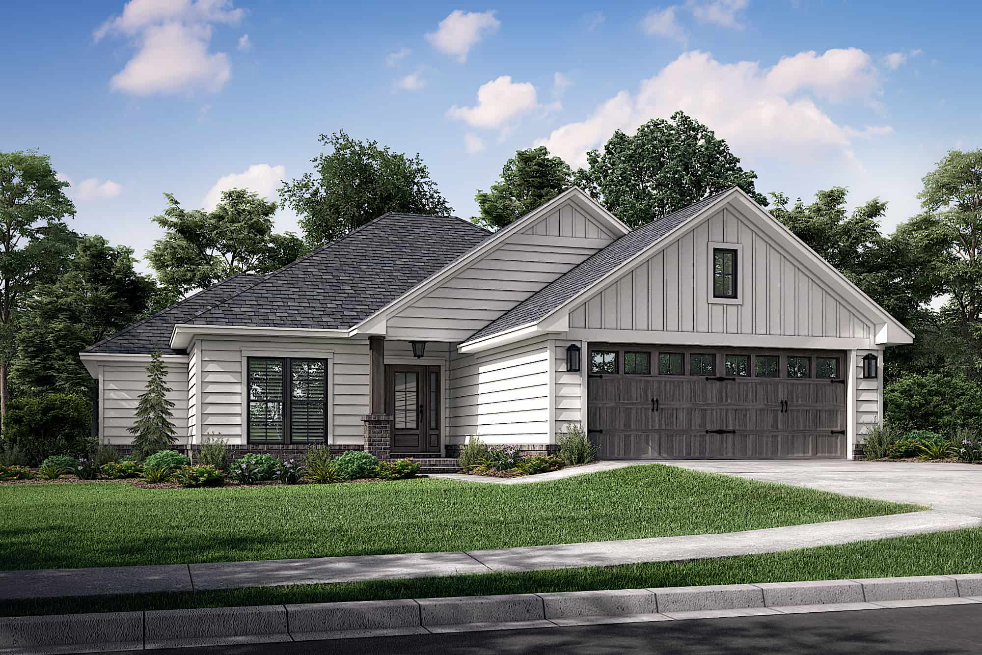 This Craftsman ranch-style home boasts impressive curb appeal. Its budget-friendly design offers 1381 square feet of living space, including three bedrooms and two full bathrooms. The split bedroom layout provides a nice touch of privacy, while the open floor plan creates a great flow between the living areas.