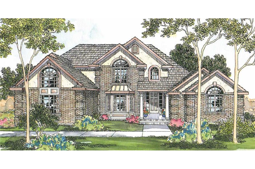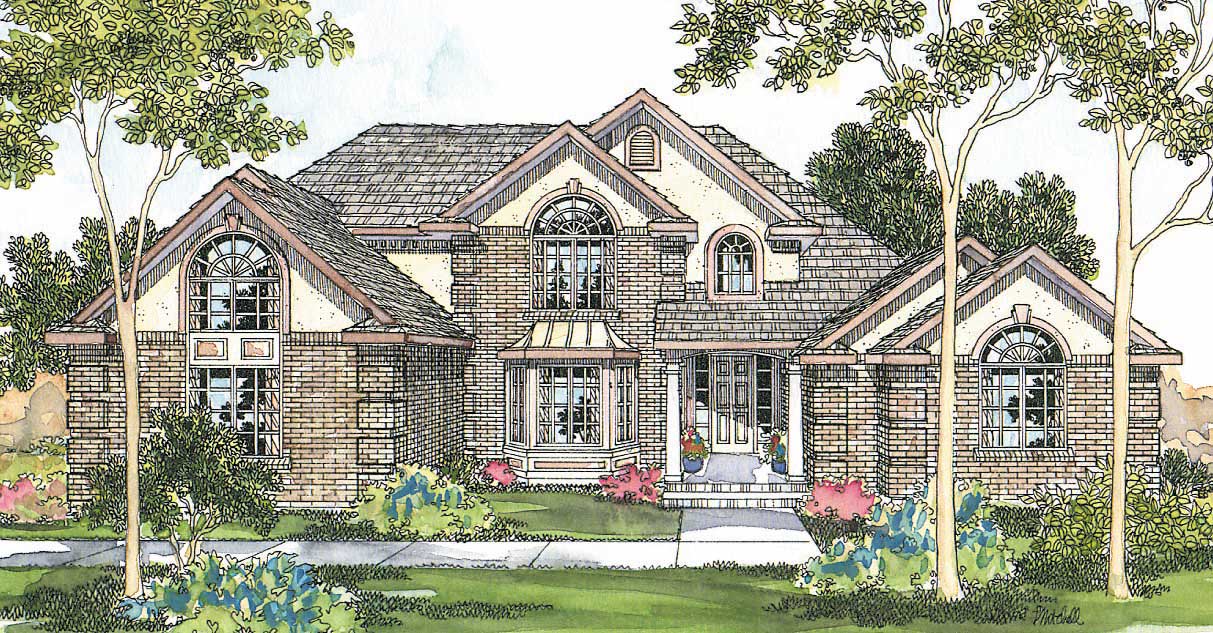 The #108-1286 home plan is a two story, transitional style house plan with 3541 total living square feet. This transitional home plan features corner quoins and keystone arched windows that create a stately appearance. A two-story vaulted great room is open to a big kitchen that accesses the wide patio. The rambling master suite closet wraps around the luxury master bathroom.