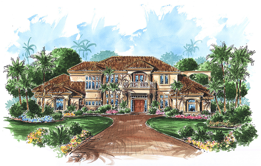 This lovely Mediterranean style home with Tuscan influences (House Plan #175-1178) has 5223 square feet of living space. The 2 story floor plan includes 4 bedrooms.