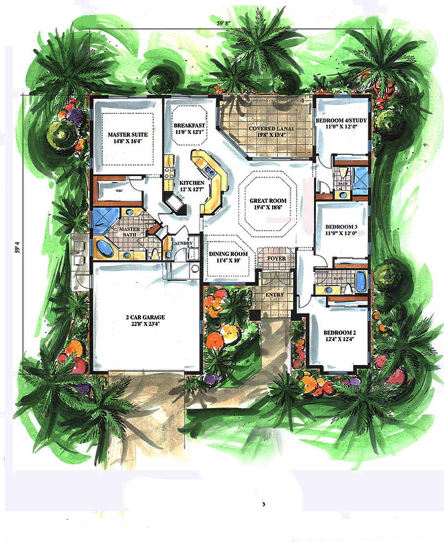 This lovely Mediterranean style home with Tuscan influences (House Plan #175-1202) has 2259 square feet of living space. The 1 story floor plan includes 4 bedrooms.