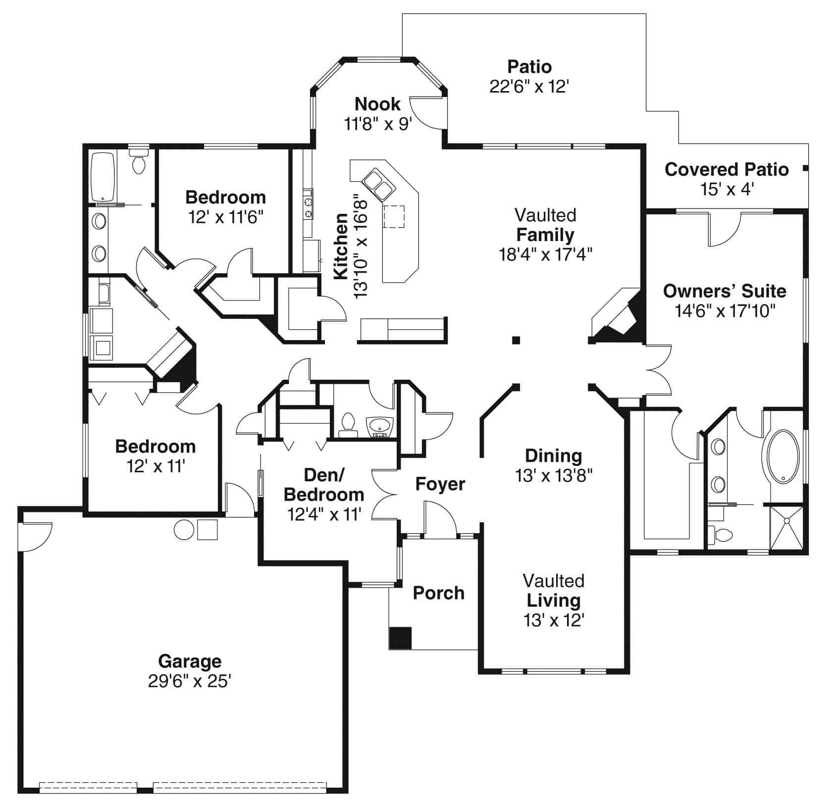This single-story, traditional-style home has 2660 total living square feet. Skylit octagonal hallway nexus links garage, bedrooms, and kitchen of this traditional home plan. Gathering spaces include a family room, living & dining rooms, den. The wide and bright bayed nook expands the kitchen which has an island, as well as an eating bar.