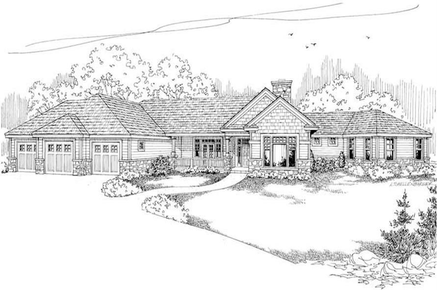 The #108-1268 home plan is a single story ranch style house plan with 3384 total living square feet. This contemporary ranch home plan features a luxurious two-sided fireplace that can be enjoyed from both dining and living room. Spacious and dramatic vaulted gathering spaces suit families who like to entertain. The library/den has front access making it an ideal location for a home office.