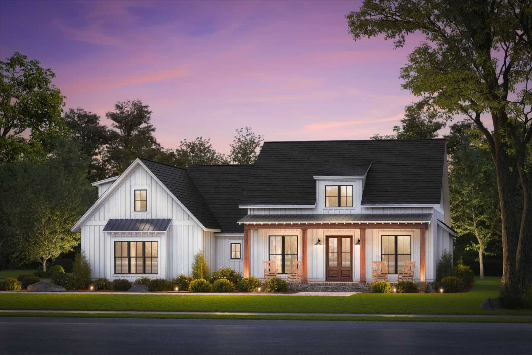 As you make your way up the driveway, this striking modern farmhouse certainly catches your eye. The style embraces the best of Craftsman and Arts & Crafts architecture while also adding a contemporary vibe to the design. The low pitched roof of the porch is supported by boxed columns. The windows are well-framed between the columns. The double door entry makes quite a statement -- and the shed dormer window right above it adds even more character.