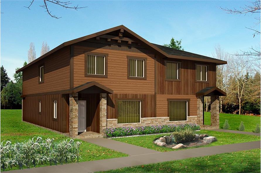 This stunning rustic duplex has 1543 sq ft and 4 bedrooms per unit. Each unit in the 2-story floor plan enjoys an open floor plan. The exterior of this home has a graceful portico. Inside, this house design's floor plan includes a well-designed eat-in kitchen.