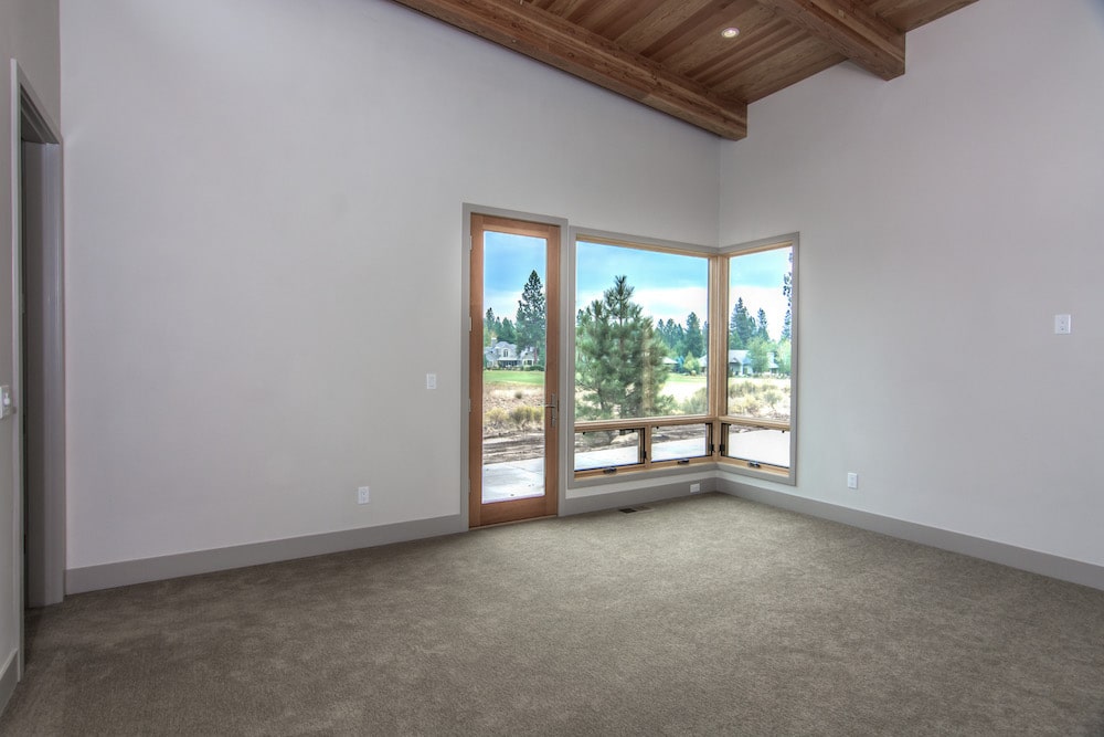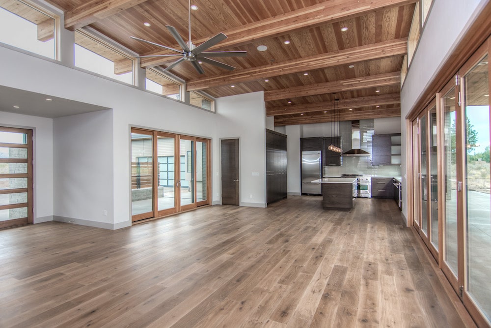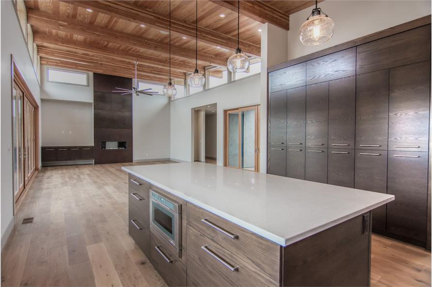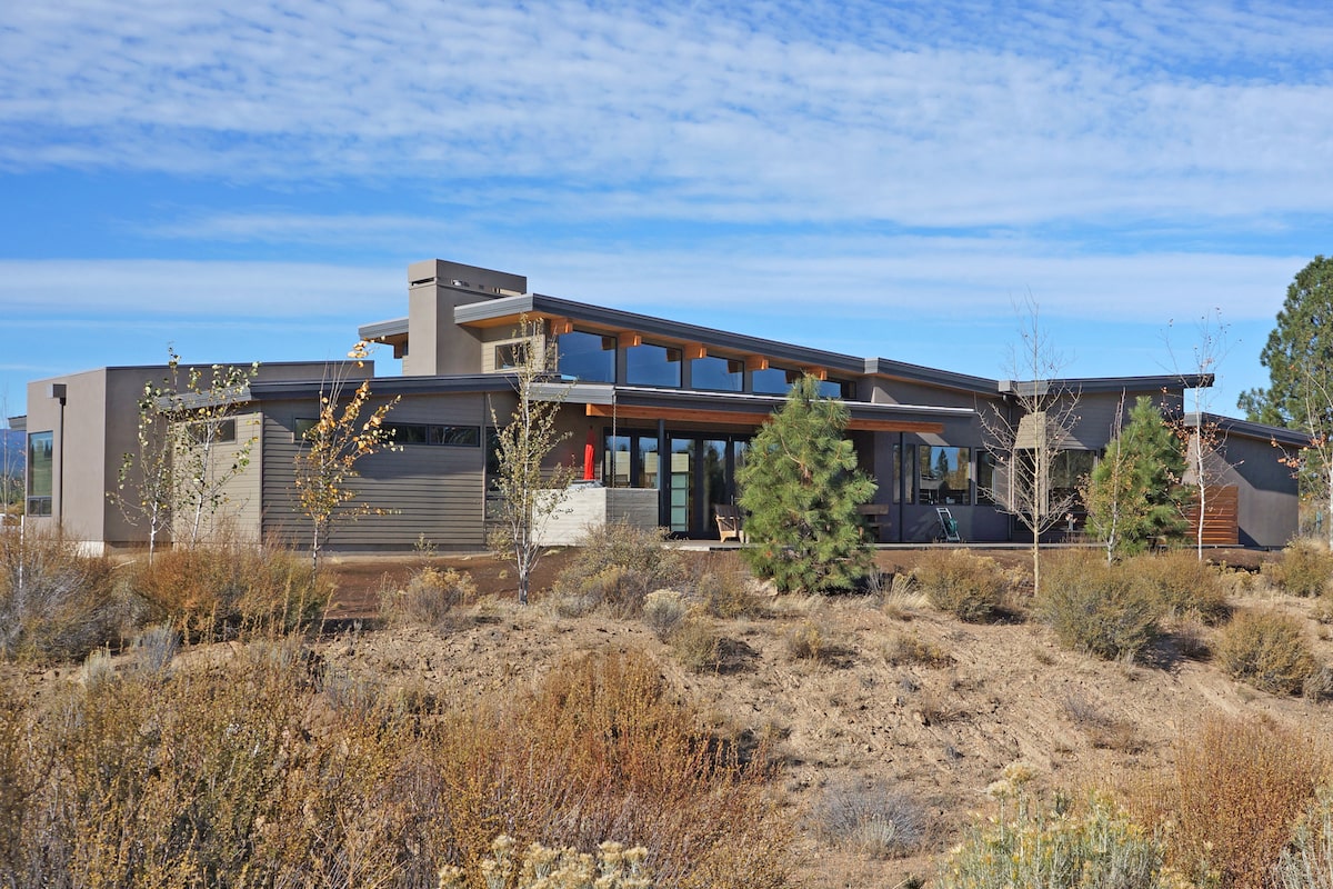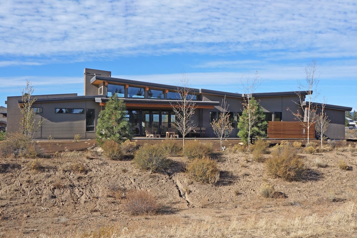 The home has a 15-foot-9-inch-high shallow shed vaulted roof with clerestory windows on both sides of the Great Room. There is a 22-foot-wide stacking door opening to the covered area outside at the rear and a 12-foot door to a private screened patio area at the front of the home. The master suite is separated from the other two bedrooms with a den adjacent. The two bedrooms...