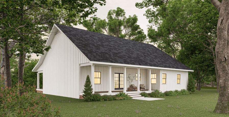 This Ranch-Country style has an asphalt shingle covered roof with forward-facing gable, and this, together with the nice combination of natural wood and the colonnaded front porch, gives the home an interesting character. The house has a heated area of 1611 square feet and a 485-square-foot 2-car garage with side entrance at the front of the house