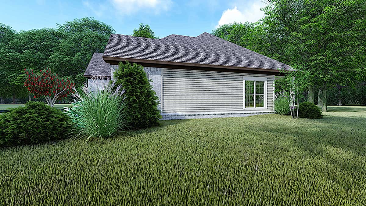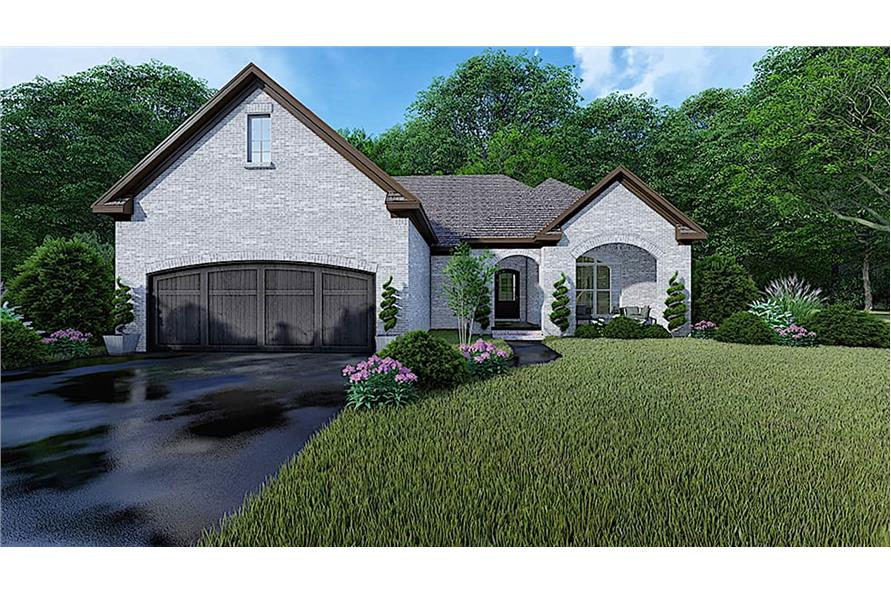 A lovely covered front porch with arched openings creates an inviting entry to this spacious French Country style home. The light-colored brick siding in front, large front window, and graceful arches over the garage and front porch complete the elegant look of the house. The beautiful 1-story floor plan has 1493 square feet of fully conditioned living space and includes 3 bedrooms, along with bonus space over the garage.