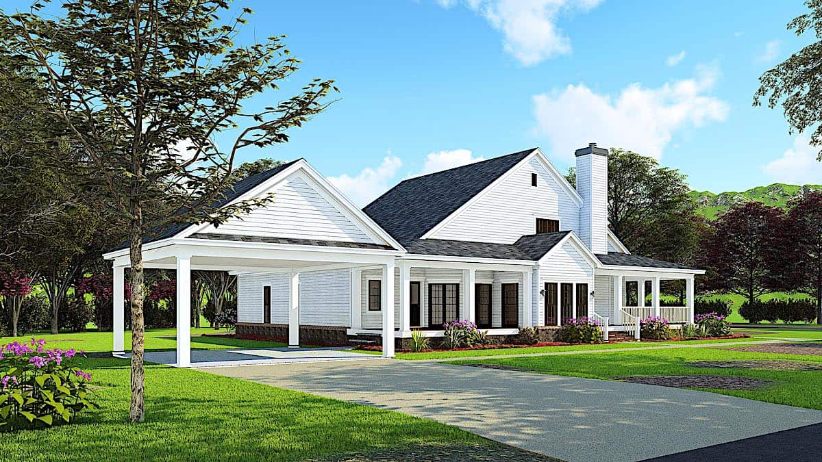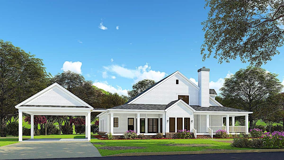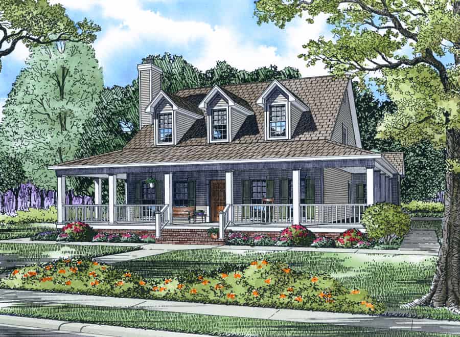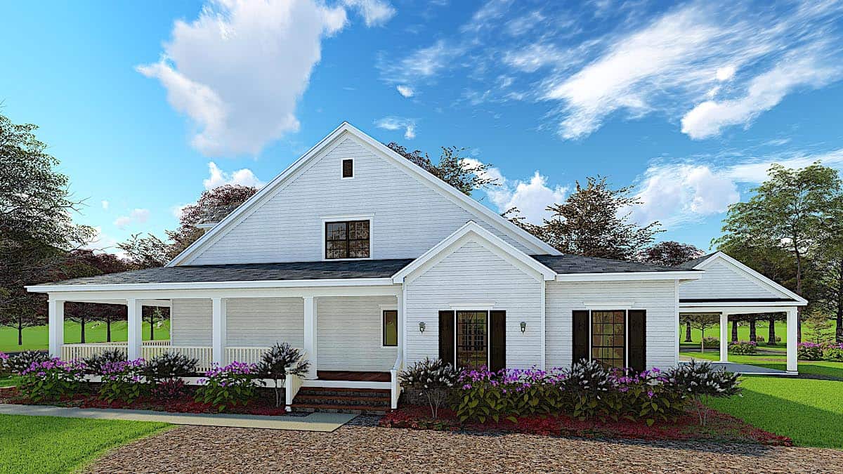 This remarkable home highlights one of the classic elements of a Southern county house plan: a deep, wraparound front porch providing plenty of shade from the sun and space for outdoor relaxation or entertaining. From the front porch, step inside. You are greeted by a graceful staircase and the spacious great room with its attractive fireplace. Steps away from the great room is the dining room, which is accented by columns and windows on three sides. The dining room is open to the chef-worthy kitchen. The kitchen boasts a huge island and an eating bar....