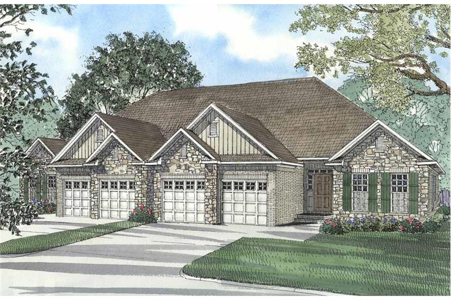 This attractive duplex plan with traditional details (Multi-Family Plan #153-1585) has 1520 square feet of living space per unit. The 1-story floor plan includes 3 bedrooms, 2 bathrooms, and a 2-car garage per unit.