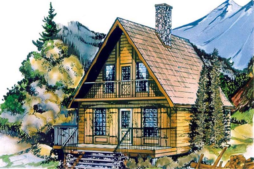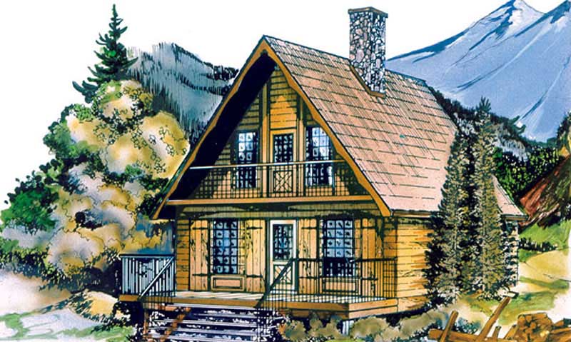 This home is enhanced by a steep gable roof, scalloped fascia boards, and fieldstone chimney detail. The front-facing deck and covered balcony add to outdoor living spaces. The fireplace is the main focus in the living room. The roof pitch is 14/12