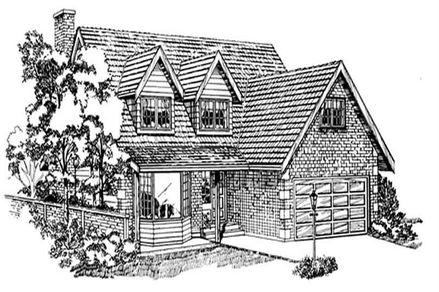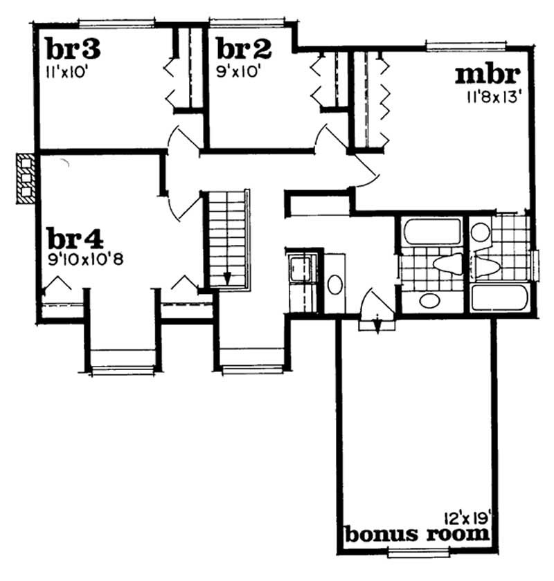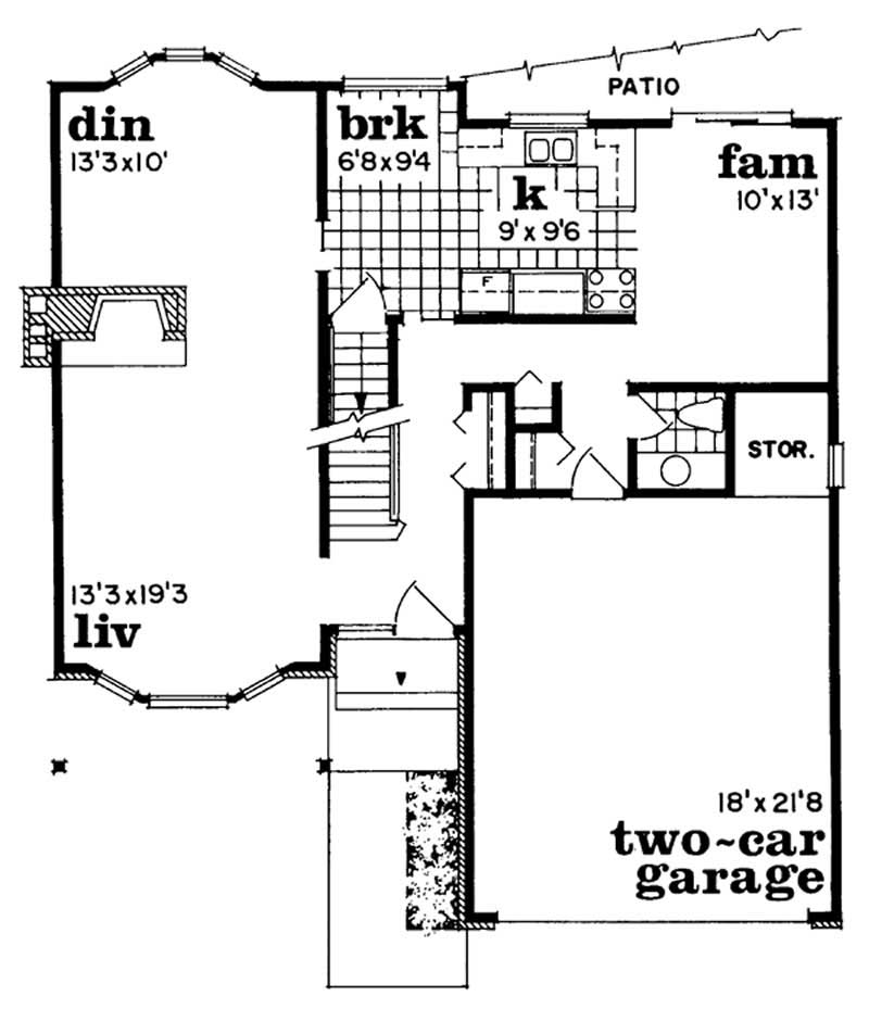 Bay windows accent both the dining room and living room, which are separated by a dominating masonry fireplace. The family room, which opens to the rear patio, and the breakfast area flank the galley-style kitchen.