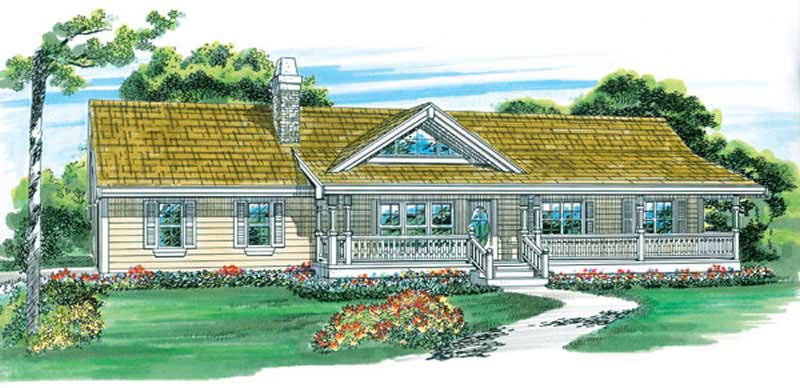 An eyebrow dormer and a large veranda give guests a warm country greeting outside, while inside vaulted ceilings lend a sense of spaciousness to this three-bedroom home. A bright country kitchen boasts an abundance of counter space. This design has a style all its own with an open feel that isn't common in most small house plans.