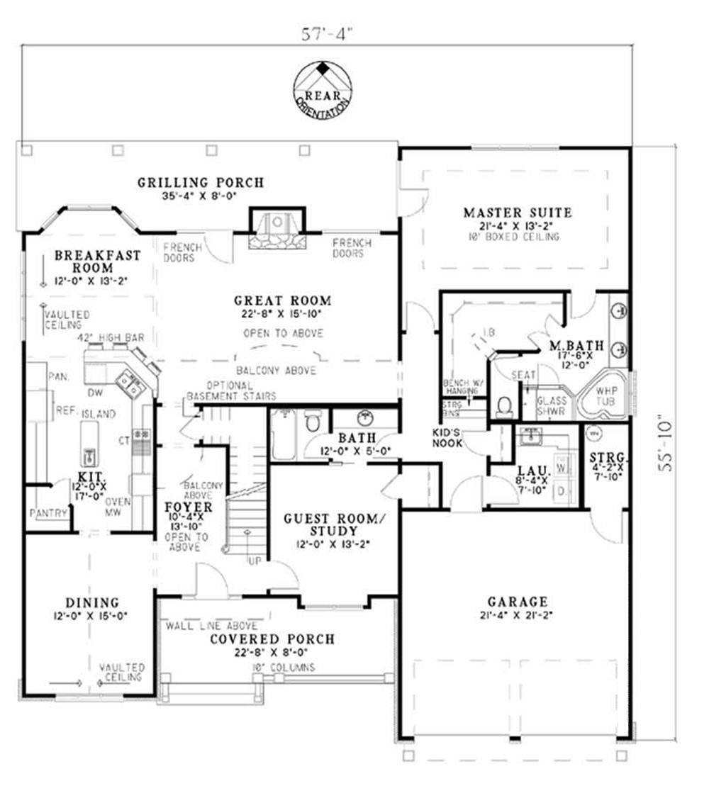 Covered Front Porch with columns. Foyer with open ceiling to above Balcony. Guest Room / Study with private bath access. Great Room with open ceiling to above floor and balcony, fireplace and French doors to the Rear Grilling Porch. Dining Room with vaulted ceiling. Kitchen with center island work area, walkin pantry and open to the Breakfast Room. Breakfast Room with vaulted ceiling and rear view of the home. Master Suite with 10ft box ceiling and access to Rear Porch. Master Bath with walkin closet with a builtin ironing board, corner whirlpool tub, glass shower and split vanities....