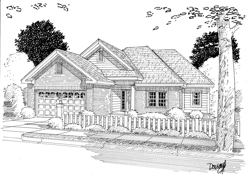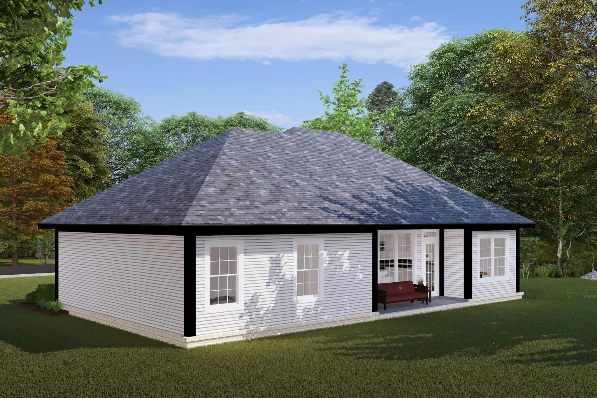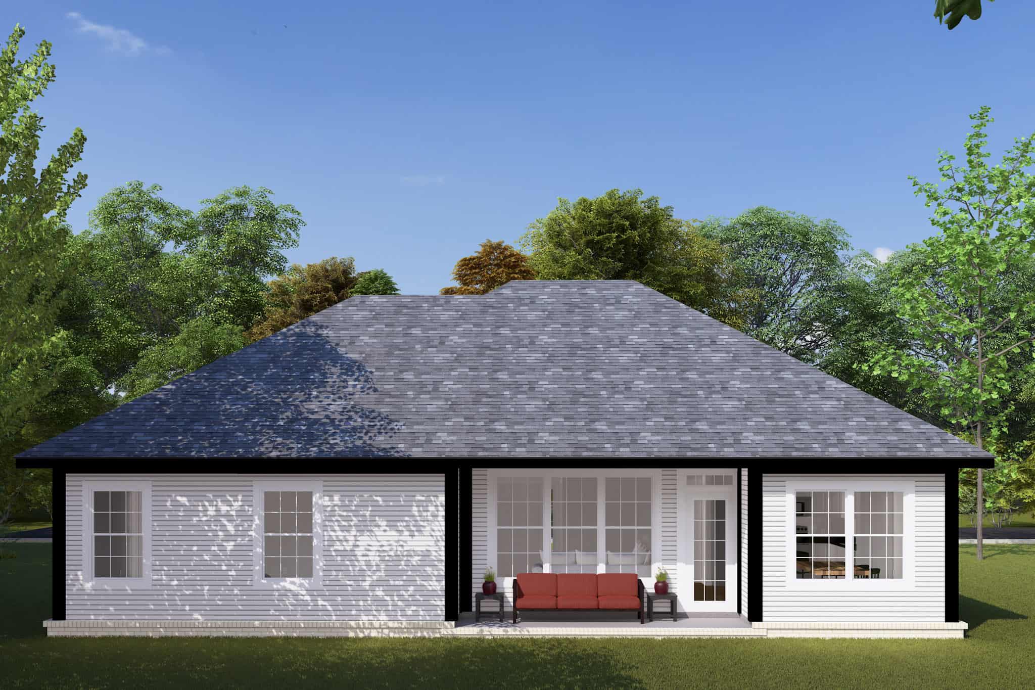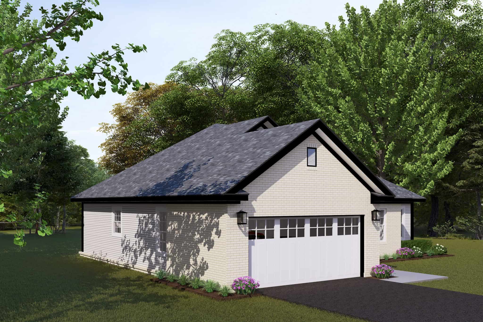 Step inside this lovely Ranch-style home plan from the covered front porch. You are immediately greeted by the spacious floor plan’s living room. The wonderful open floor plan of this home creates a great social atmosphere. The living room has access to the rear covered porch and seamlessly flows into the kitchen and dining area. The kitchen is a great L-shape and features an island with a built-in eating bar. The kitchen and dining space both have 9-foot-high ceilings. From the kitchen/living room corner, you have access to the two-car, front-entry garage.
