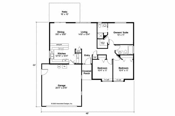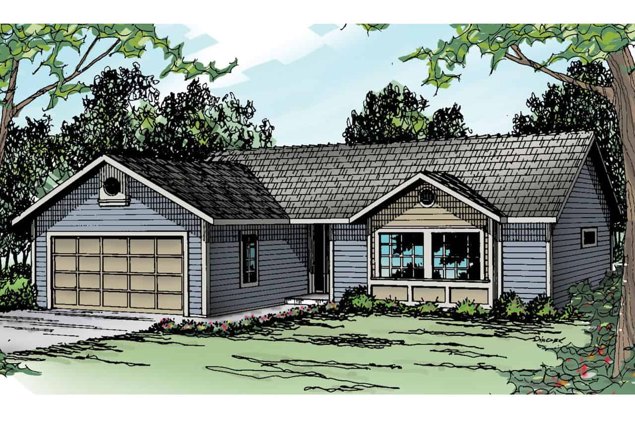 The #108-1216 home plan is a single story, ranch style house plan with 1156 total living square feet. This ranch home plan features a compact single-story design, thrifty to build and maintain. The kitchen has a long eating bar which opens to the dining and living rooms. Three bedrooms and two bathrooms cluster together in the right wing.