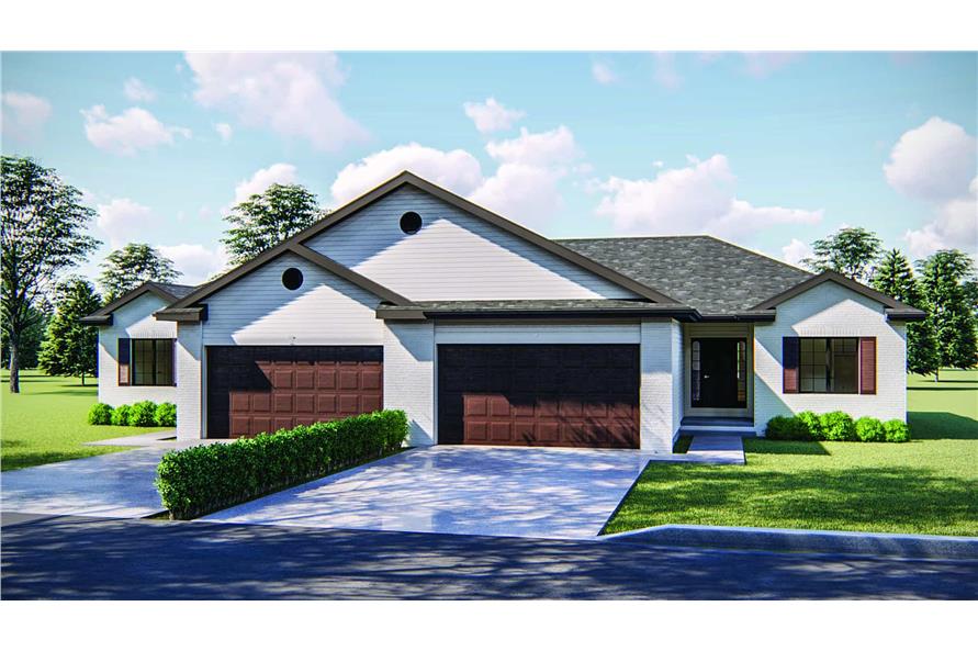 This duplex with cottage influences has 1189 square feet of living space per unit. The 1-story floor plan includes 2 bedrooms per unit. The total width is 78 feet and the total depth is 51 feet.