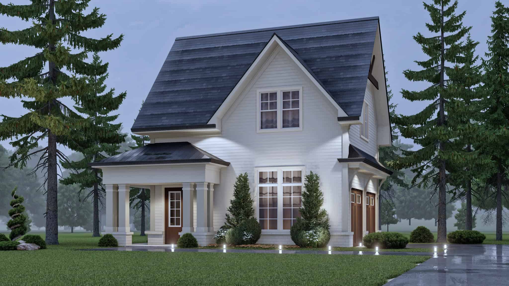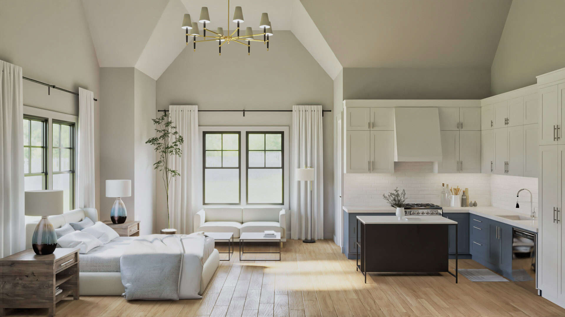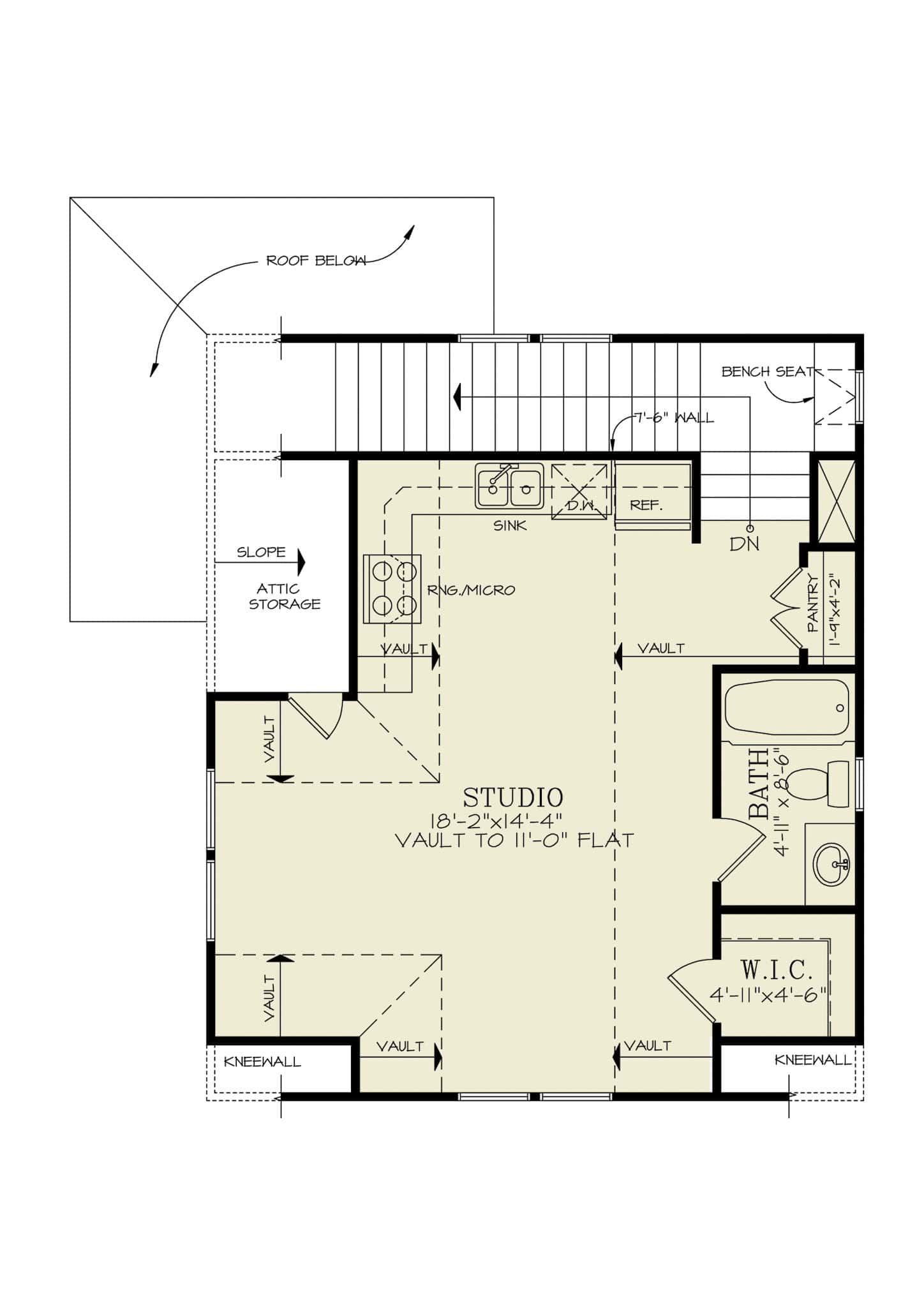 Combining the cozy appeal of Modern Farmhouse style with functional design, this garage plan features 569 square feet for a two-car garage, complemented by 1,219 square feet of fully conditioned living space on the same level. The interior layout includes a spacious studio, a full bathroom with a walk-in closet, and a thoughtfully designed kitchen complete with a pantry.